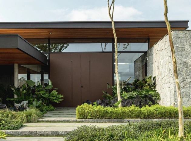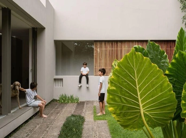 Warm wood tones and gentle light define the bedroom’s serene character. Large windows open to the garden, allowing each morning to begin with sunlight and greenery — a quiet moment of renewal.